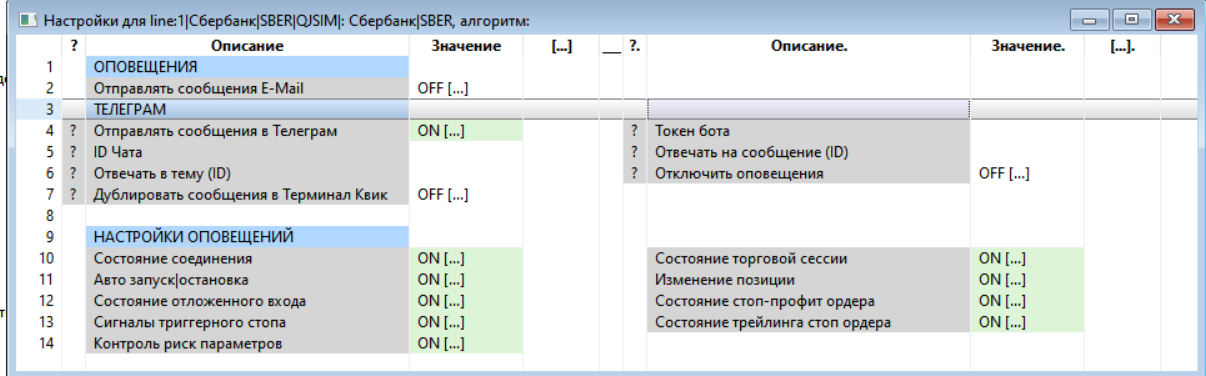 – Подключить возможность указания индивидуальных настроек Телеграм: – Настройки отправки сообщений в Телеграм задаются в каталоге сервера отправки сообщений. По умолчанию они находится в /commonLibs/telegramServer/settings.ini – Эти настройки обязательны для корректной отправки сообщений. – Но также для отдельного инструмента можно указать свои настройки, переопределяющие основные настройки. – Например, указать другой токен бота, другой список чатов, отвечать на сообщение(id), отвечать в тему(id) чата, группы. – Т.о. для конкретной строки инструмента сообщения будут уходить в соответствии со своими настройками. – Если включено, то появится раздел настроек отправки сообщений в Телеграм TELEGRAM_SETTINGS = 0